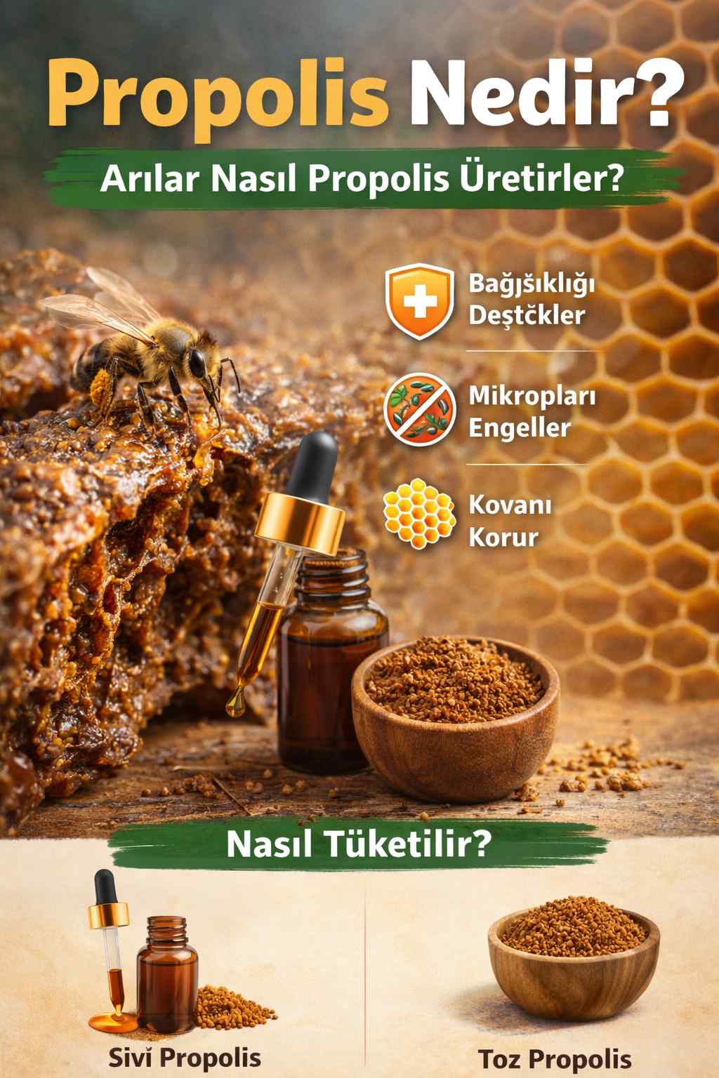 Propolis, arıların doğadan topladığı bitkisel reçinelerden ürettiği doğal bir arı ürünüdür. Arılar bu maddeyi kovanlarını korumak ve mikroorganizmalara karşı savunmak için kullanır.